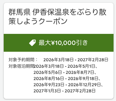 - 群馬県伊香保温泉クーポン ※2027年2月28日(土)まで