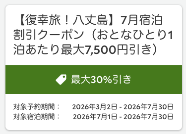 - 【復幸旅!八丈島】7月宿泊割引クーポン ※7月30日(木)まで
