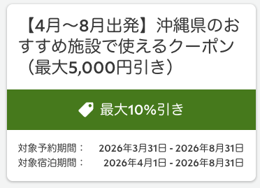 - 4月~8月出発・沖縄県クーポン ※8月31日(月)まで