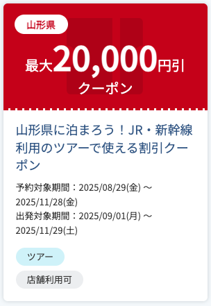 - 山形県に泊まろう!JR・新幹線利用のツアーで使える割引クーポン ※11月28日(金)まで