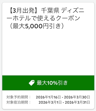 - 【3月出発】千葉県 ディズニーホテルで使えるクーポン ※3月30日(月)まで
